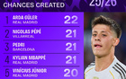 • 本赛季西甲创造机会榜:居莱尔22次居首,佩佩、佩德里21次