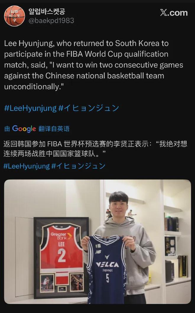 韩国男篮当家球星李贤重接受采访谈及接下来与中国男篮的世预赛大战,表示肯定想要两战全部取胜。今年亚洲杯八强赛,中国男篮79-71击败韩国男篮,此役李贤重出手15次中6球,其中三分11中2,罚球9中8空砍22分外加7板4助,赛后痛哭流涕。