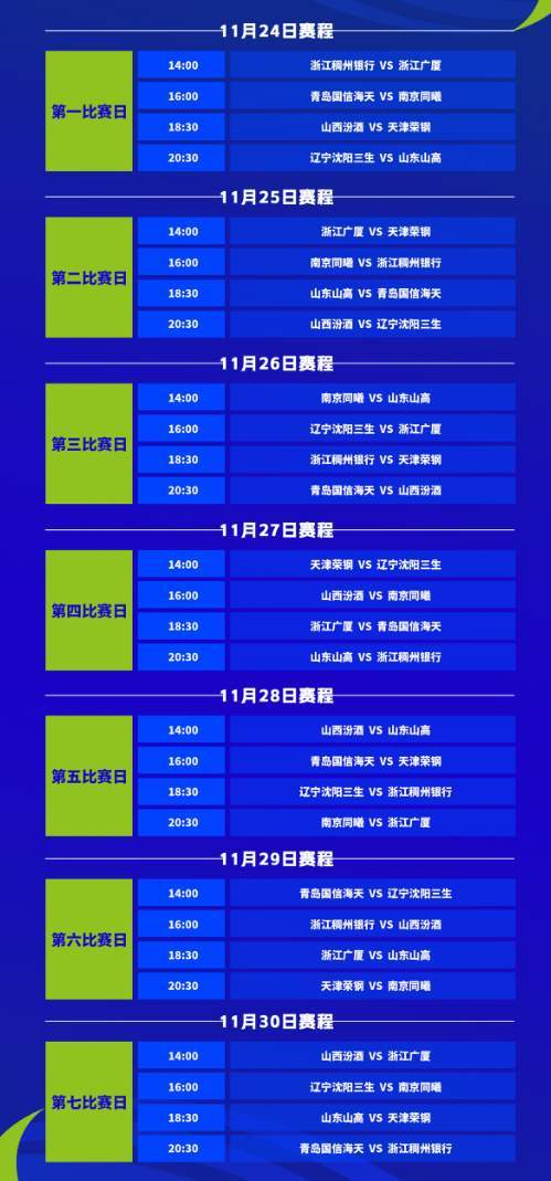 山东U19男篮的赛程已经出炉,11月24日晚上20:30,对阵辽宁。11月25日晚上18:30,对阵青岛,11月26日下午14点,对阵南京,11月27日晚上20:30,对阵浙江,11月28日下午14点,对阵山西,11月29日晚上18:30,对阵广厦,11月30日晚18:30,对阵天津。