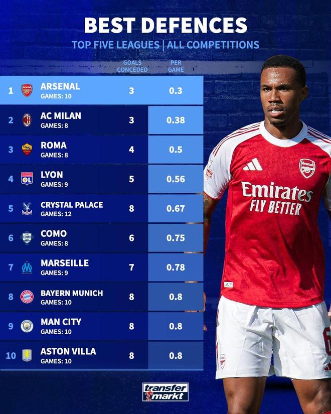 德国转会市场网站列出了本赛季五大联赛球队各项赛事场均丢球最少排行榜,阿森纳以0.3球排名第一,米兰第二,罗马第三。